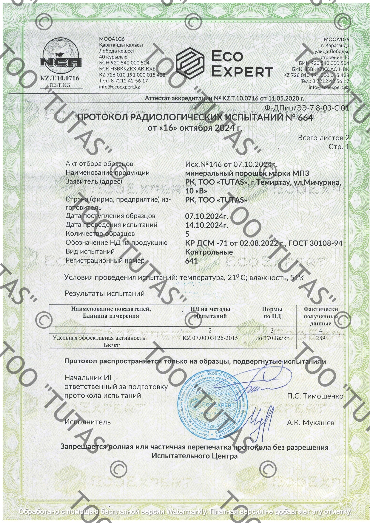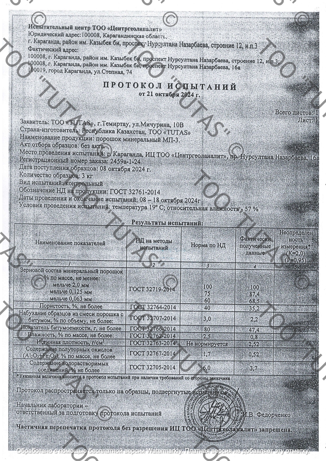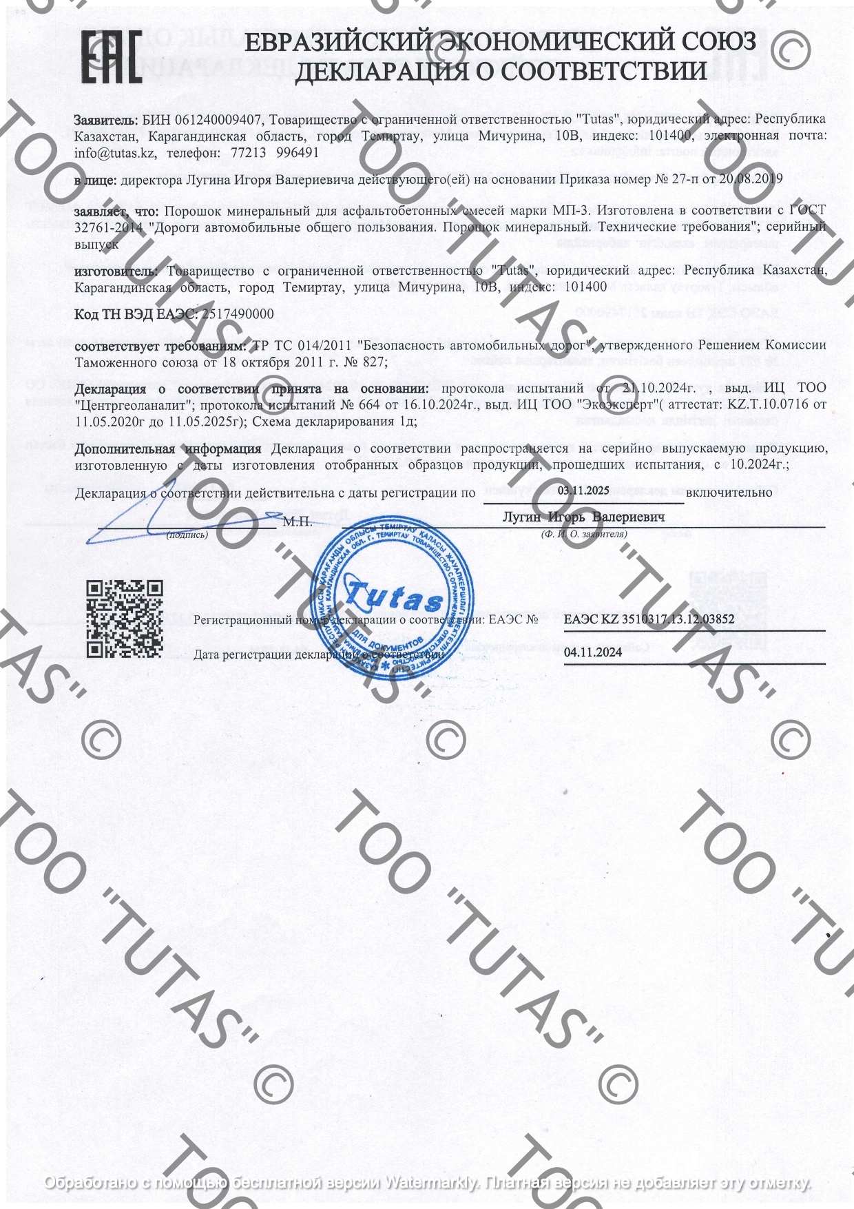 ГОСТ, сертификаты, заключения на Минеральный порошок ТОО TUTAS