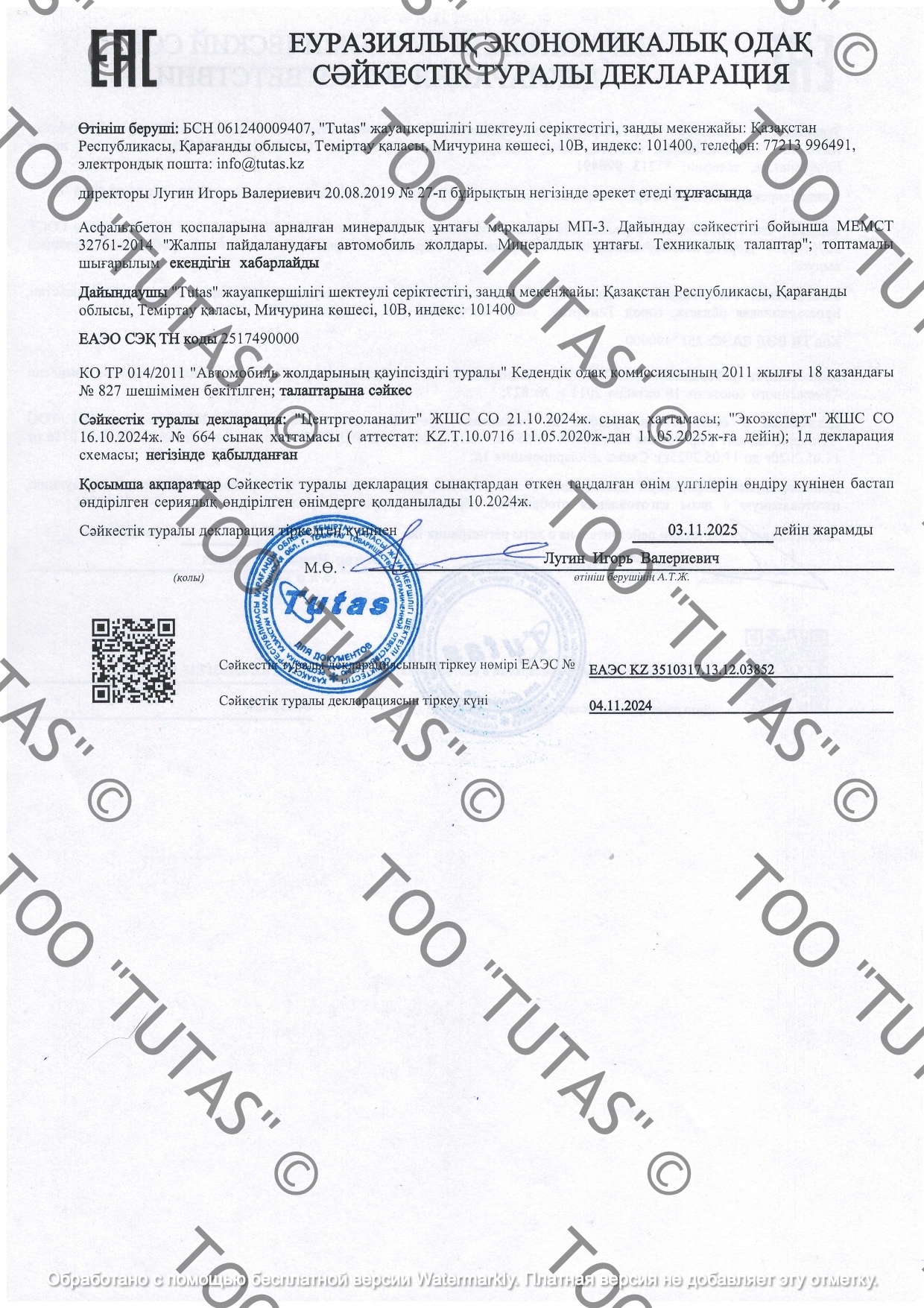 ТОО «TUTAS» имеет сертификат происхождения товара СТ-KZ и Декларацию о соответствии для Таможенного союза.